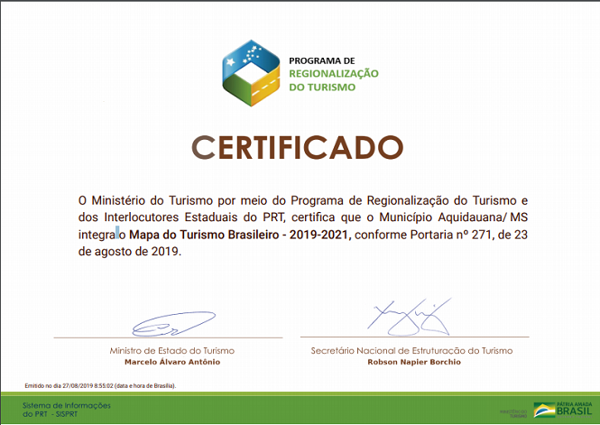 Aquidauana recebeu três certificados, cuja a certificação é uma maneira de comprovar que o município está inserido no Mapa e faz parte do rol de 2.694 destinos brasileiros que trabalham o turismo como política de desenvolvimento econômico e geração de emprego e renda.