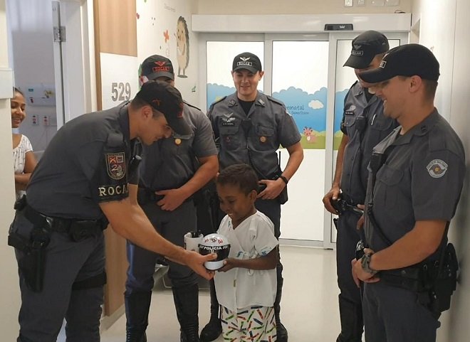O pequeno João Vitor recebeu no hospital visita mais do que importante das equipes de ROCAM - Rondas Ostensivas com Apoio de Motocicletas do 2° Batalhão de Choque da PM de São Paulo para entrega de lembranças que o farão recordar por toda sua vida desses dias em São Paulo.