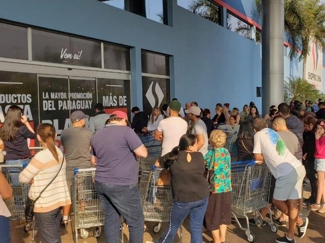Clientes na fila esperando abertura de shopping de importados às 7h de hoje, em Pedro Juan Caballero (Foto: Mbykymi Notícias)