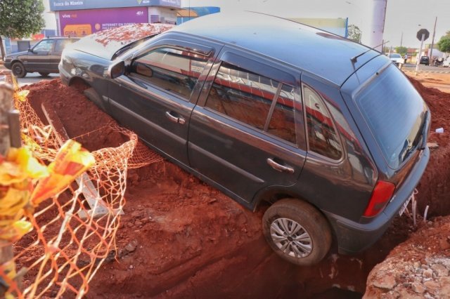 Um VW Gol ficou preso numa vala aberta na Avenida Bandeirantes, Campo Grande. A via passa por obras de drenagem antes de ser recapeada e segundo o operador de caixa, de 27 anos, a sinalização da obra estava muito próxima ao buraco.