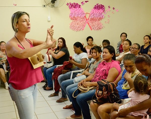 As Secretarias de Saúde e de Assistência Social se uniram levando palestra e oferta de brindes para dezenas de mulheres que participaram ouvindo atentamente as explicações da enfermeira Danielle Alves.