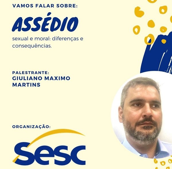 No próximo sábado, às 10 horas o Juiz de Direito da Comarca de Aquidauana Dr. Giuliano Maximo Martins será o palestrante de um evento do SESC/SENAC cujo tema trata de &39;Assédio sexual e moral: diferenças e consequências&39;.
