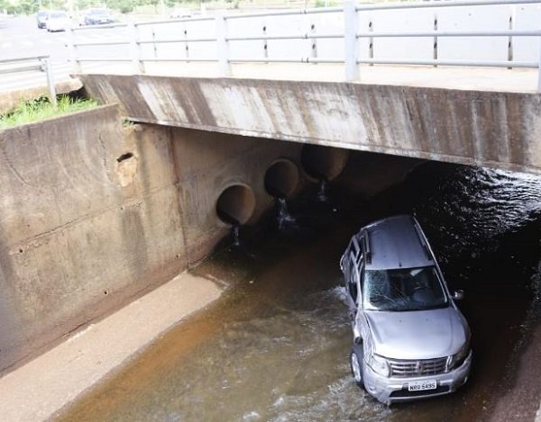 Motorista perde o controle e cai com carro em córrego na Ernesto Geisel