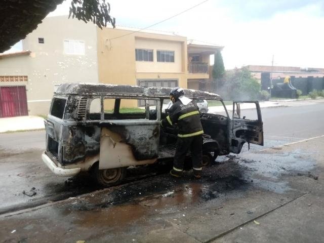 Veículo Volkswagen Kombi ficou destruído após incêndio, ontem, sábado (5), na Rua Edu Rocha, esquina com a Rua Campo Grade, no bairro Aeroporto, em Corumbá – distante 419 quilômetros da Capital. De acordo com o motorista, de 44 anos, o fogo começou após explosão no motor.
