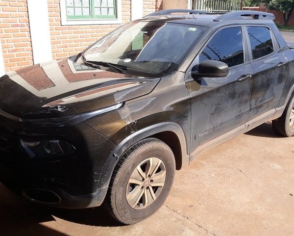 Diante dos expostos a equipe policial realizou diligências com intuito de localizar o veiculo em questão e visualizou o suspeito na Rua General Rondon, um veículo modelo Toro com placas de Santa Catarina, visto que a parte frontal do veiculo estava amassada e com resquício de tinta branca da mesma cor do portão danificado e com o para-brisa quebrado.
