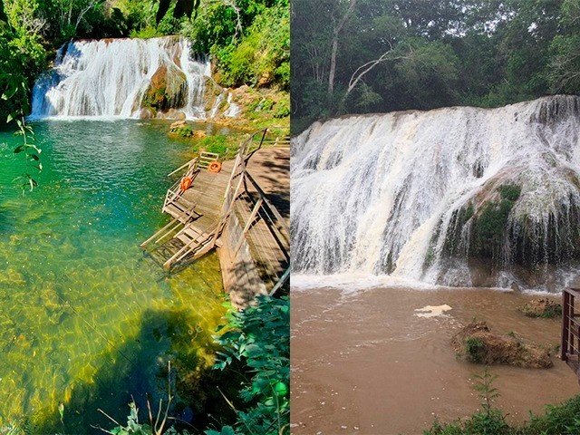 Antes e depois da Cachoeira da gruta, em janeiro, mostram o que ocorre quando o rio não é protegido