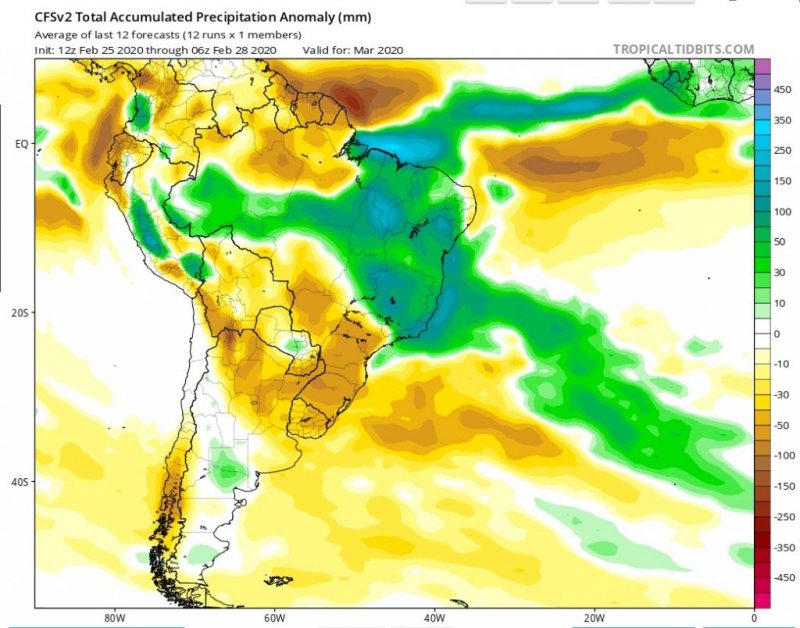O mapa de anomalia de precipitação prevista pelo modelo internacional CFSv2/NOAA mostra que as chuvas poderão ficar abaixo da média em todo o Estado, especialmente nas regiões central, noroeste e norte, representado pela coloração amarela.