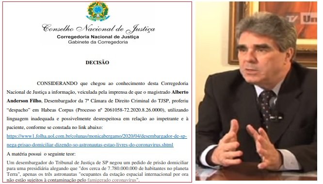 O ministro Dias Toffoli, presidente do Conselho Nacional de Justiça, instaurou procedimento para esclarecer a decisão do desembargador Alberto Anderson Filho, que negou pedido de prisão domiciliar a uma presidiária sob o argumento de que apenas três astronautas “ocupantes da estação espacial internacional por ora não estão sujeitos à contaminação pelo famigerado coronavírus”.