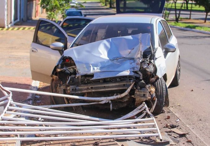 O motorista de um Fiat Punto, de cor prata, perdeu o controle do veículo depois de “rampar” o quebra-molas, atravessou o canteiro central e atingiu o muro e a porta de uma loja de celulares na Rua da Divisão, no Jardim Parati, região sul de Campo Grande. O acidente ocorreu na manhã deste domingo (5).
