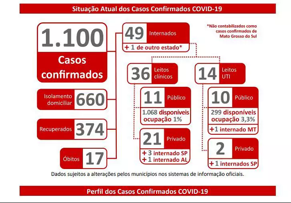 Campo Grande novamente teve número baixo, apenas 4 casos novos e 249 no total. No Estado hoje, 660 pessoas seguem em isolamento domiciliar, 374 tiveram alta da quarentena e 17 morreram.