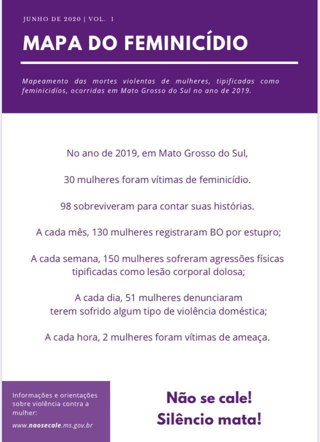 Em parceria com a Delegacia-Geral da Polícia Civil, a Subsecretaria de Políticas Públicas para Mulheres (SPPM) lançou nesta segunda-feira (1º/6) a primeira edição do Mapa do Feminicídio de Mato Grosso do Sul: um mapeamento dessas mortes violentas ocorridas em Mato Grosso do Sul no ano de 2019. O estudo divulgado neste Dia Estadual de Combate ao Feminicídio servirá como subsídio para elaboração de políticas públicas de enfrentamento à violência.