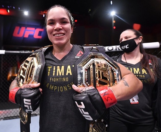 Amanda Nunes exibe os dois cinturões do UFC — Foto: Getty Images
