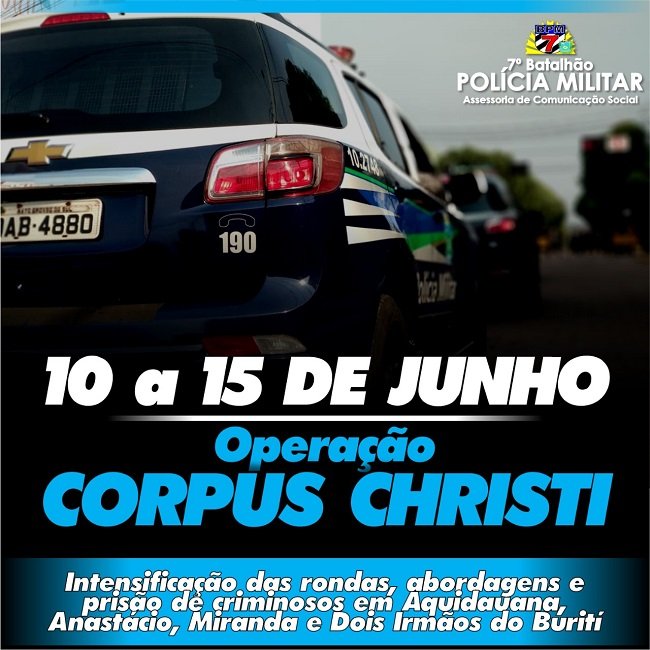 O 7º Batalhão PM iniciou ontem (10.06), a “Operação Corpus Christi”, em toda sua área de atuação (Aquidauana, Anastácio, Miranda, Dois Irmãos do Burití e seus respectivos distritos).