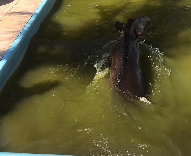 Mesmo depois de notificada verbalmente a realizar a proteção de uma piscina, a proprietária de uma chácara acionou hoje a PMA para retirar uma anta de sua piscina.