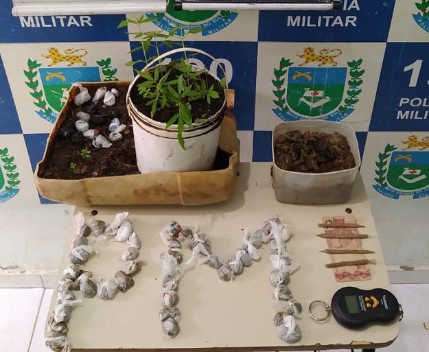 Com eles, foram encontradas setenta e oito trouxinhas e quatro cigarros de substancia análoga a maconha. Questionado onde teriam conseguido a droga, os autores relataram ter uma plantação de pés de maconha escondida na mata, onde no local indicado pelos autores, foram encontrados oito pés de maconha.