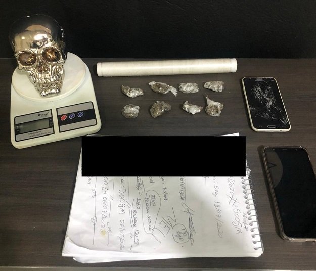 No banheiro da casa, dentro do cesto de lixo, foram localizadas oito porções (aproximadamente 28g) de maconha; na cozinha, foram encontrados um caderno contendo as anotações da venda da droga e um rolo de papel filme para embalar a substância entorpecente; no quarto, dentro do guarda roupa, foi localizada uma balança de precisão utilizada para pesar a droga. Do lado de fora casa foi encontrada uma motocicleta Honda, ano 2015/2015, de cor preta, utilizada para entregar o entorpecente.