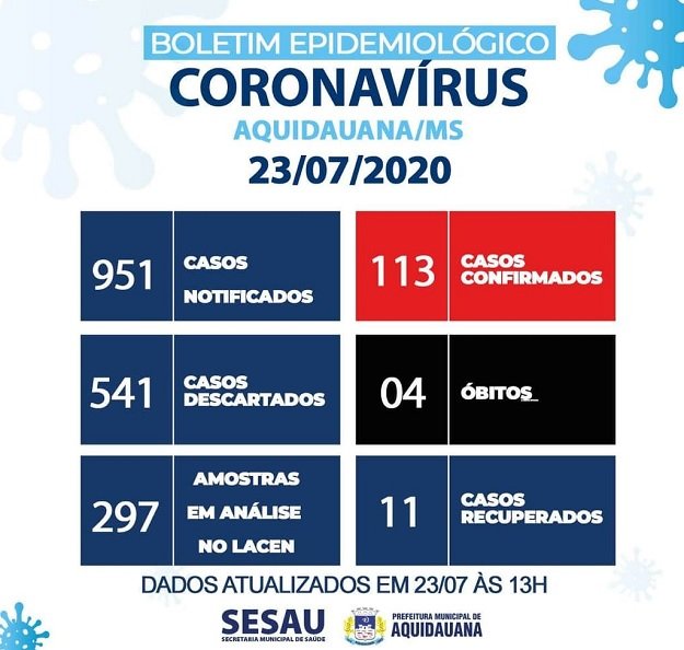 Conforme dados da Vigilância Epidemiológica Municipal, até o momento, Aquidauana tem ao todo 113 casos confirmados, sendo 04 óbitos, 11 casos recuperados e 98 casos ativos.