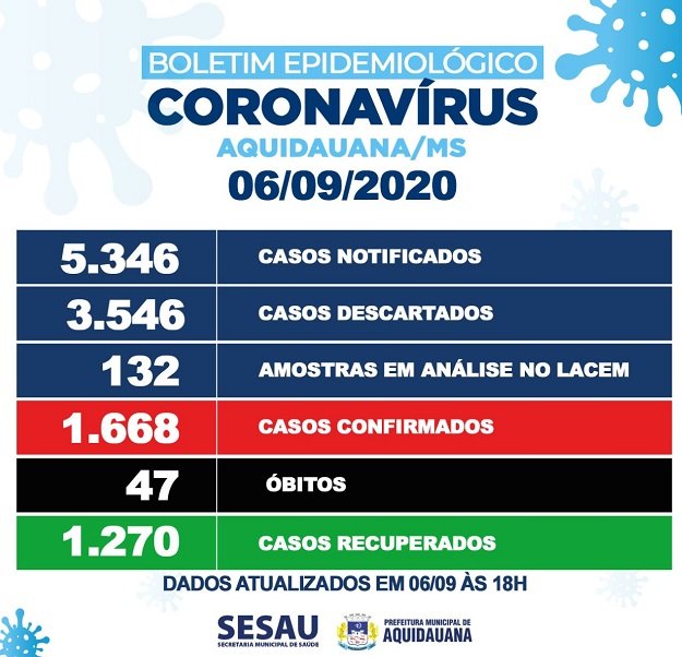 Aquidauana, até o momento, tem ao todo 1.668 casos confirmados, desses 351 pessoas positivas ativas e 47 óbitos, sendo 22 de indígenas e 25 não indígenas.