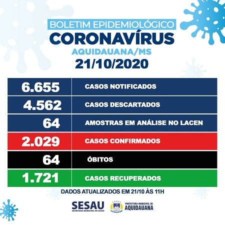 Aquidauana, neste dia 21, tem 06 novos casos positivos de coronavírus, todos cidadãos não indígenas residentes na cidade, e nenhum novo óbito por Covid-19.