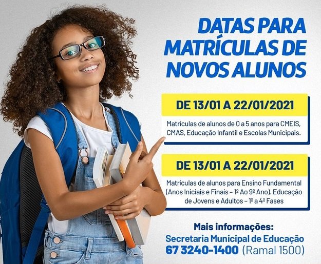 A Secretaria de Educação de Aquidauana (SEMED) informa que de 13 a 22 de janeiro está aberto o período de matrículas para alunos novos nas escolas municipais e Centros de Educação Infantil.