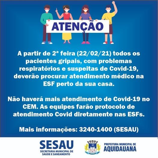 A partir de 2ª feira (22/02/21) todos os pacientes gripais, com problemas respiratórios e suspeitas de Covid-19, deverão procurar atendimento médico na ESF perto da sua casa.