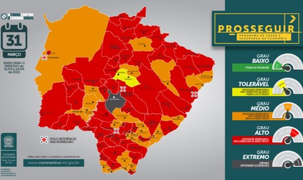O mapa situacional do Prosseguir apresentado na quarta-feira (31) mostra redução de quatro para uma o número de cidades classificadas na bandeira cinza. No novo mapa apenas Sidrolândia saiu do grau alto para o extremo, quando é recomendado apenas o funcionamento de atividades essenciais.