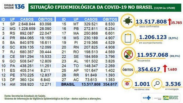 O Ministério da Saúde divulgou hoje (12) novos números sobre a pandemia de covid-19 no país. De acordo com levantamento diário feito pela pasta, o Brasil tem no acumulado 13,5 milhões de casos confirmados da doença e 354,6 mil mortes registradas. Os casos de recuperados somam 11,9 milhões.