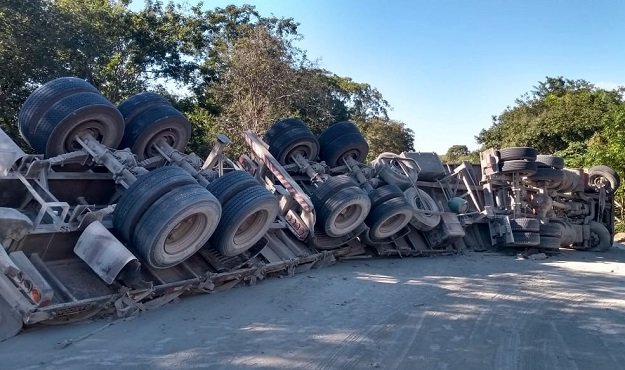 No local ocorreu um tombamento de uma carreta carregada com cimento.