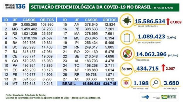 O balanço apontou também 1.089.423 pacientes em acompanhamento e 14.062.396 recuperados da doença.
