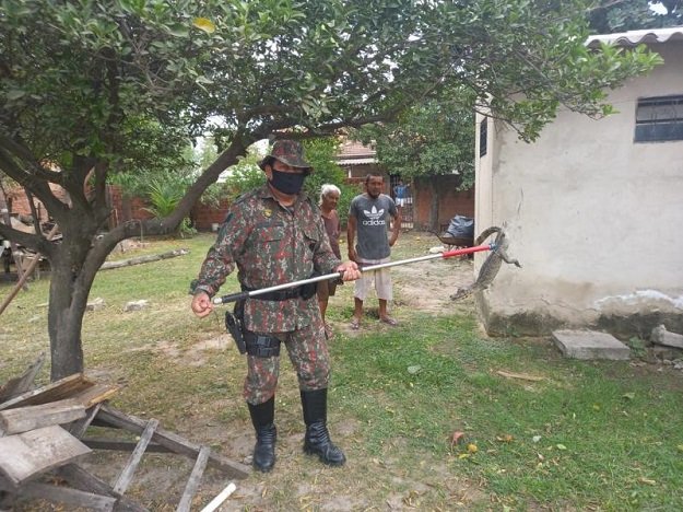 Logo em seguida, um morador também da área central telefonou para a PMA para enviar uma equipe que pudesse efetuar a captura de um jacaré que estava em uma dependência de sua residência. A equipe foi ao local e com uso de um cambão realizou a captura do jacaré e o colocou em uma caixa de contenção.