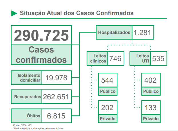 Os cinco municípios que apresentaram maior número de novos positivos nas últimas 24 horas são: Campo Grande com +869 casos; Dourados +116; Ponta Porã +80; Corumbá e Nova Andradina +56.
