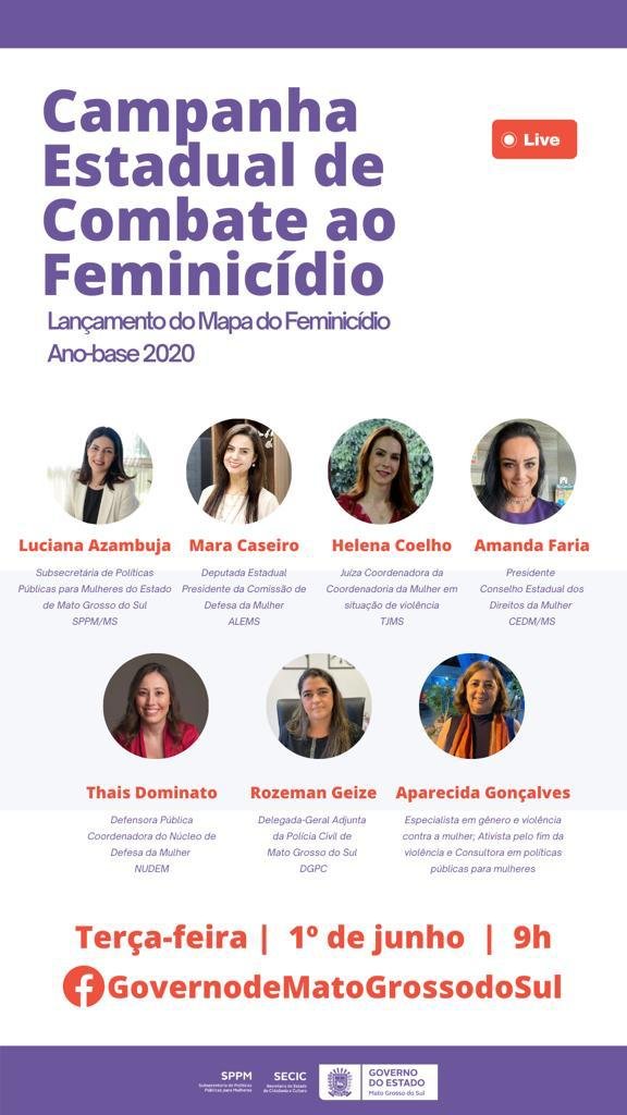 Na ocasião será lançado também a segunda edição do Mapa do Feminicídio, que traz o mapeamento das mortes violentas de mulheres, tipificadas como feminicídios, ocorridas em Mato Grosso do Sul no ano de 2020.