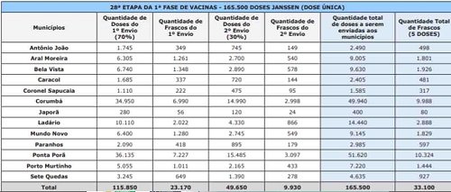 O município que faz fronteira com a Bolívia recebeu 49.940 doses. A estimativa da prefeitura é vacinar entre 7 mil e 10 mil pessoas por dia e concluir a imunização de toda a população adulta em uma semana. No total, a ação vai mobilizar 300 pessoas, sendo 90 vacinadores.