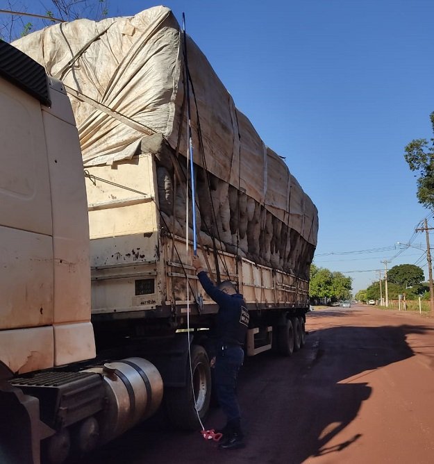 Diante do cenário apresentado, os militares procederam a abordagem, identificaram o condutor e aferiram a altura, a qual apresentou 4,84m, excedendo o permitido em lei que é de 4,40m.