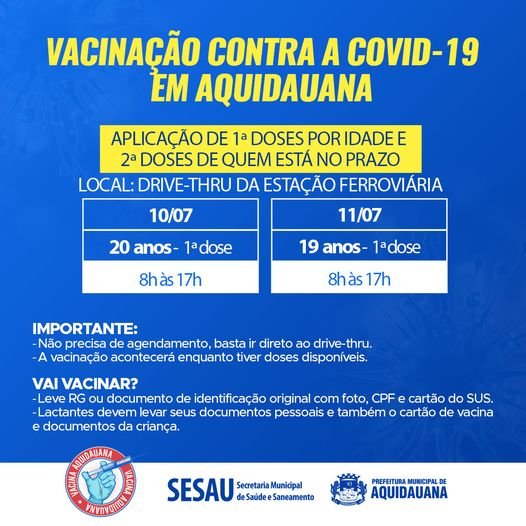 Devido a baixa procura dos jovens a partir de 21 anos para se vacinarem contra a Covid-19 e para não ficar com as doses de vacina paradas, a Secretaria Municipal de Saúde e Saneamento de Aquidauana informa que reduziu a idade de vacinação novamente já para este sábado e domingo, (10) e (11).
