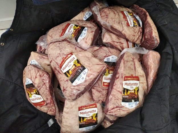 Assim, se dirigiram ao local e abordaram o homem de 24 (vinte e quatro) anos, com várias peças de carne dentro de uma blusa. Após conferência, foram contabilizados 24 (vinte e quatro) peças de picanha maturata embalada a vácuo, totalizando 38,1kg (trinta e oito quilos e cem gramas).