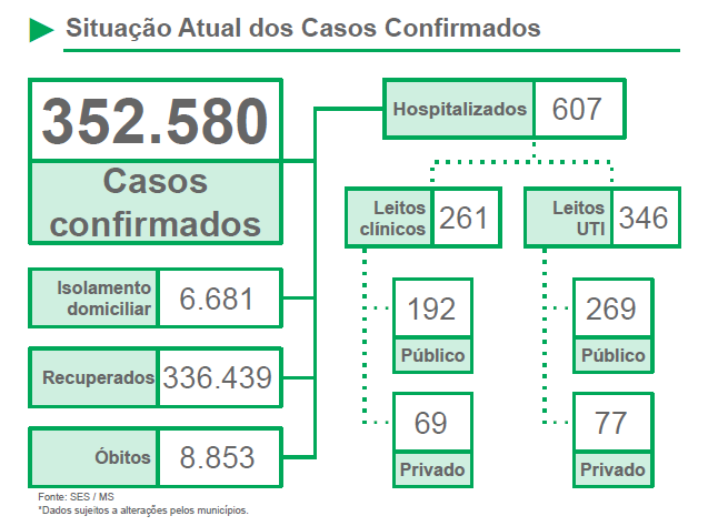 De 7.288 casos ativos em Mato Grosso do Sul, 6.681 estão em isolamento domiciliar e outros 607 são pacientes hospitalizados em leitos clínicos (261) ou de UTI (346). A taxa de ocupação de leitos UTI SUS por macrorregião de internação está em 83% em Campo Grande, 70% em Dourados, 58% em Três Lagoas e 56% em Corumbá.
