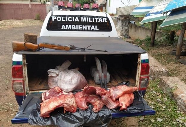 A equipe policial foi ao local e flagraram os infratores praticando caça predatória, com eles foram encontrados, 42 kg de carne de caça e um rifle calibre 22, com uma munição.