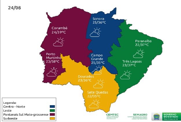 Com a atuação de uma massa de ar seco, Mato Grosso do Sul mantém as condições de tempo firme e sem probabilidade de chuva nos próximos dias. A meteorologia estima que nesta terça-feira (24) e quarta-feira (25) os dias seguirão quentes com temperaturas acima do normal para a época do ano.