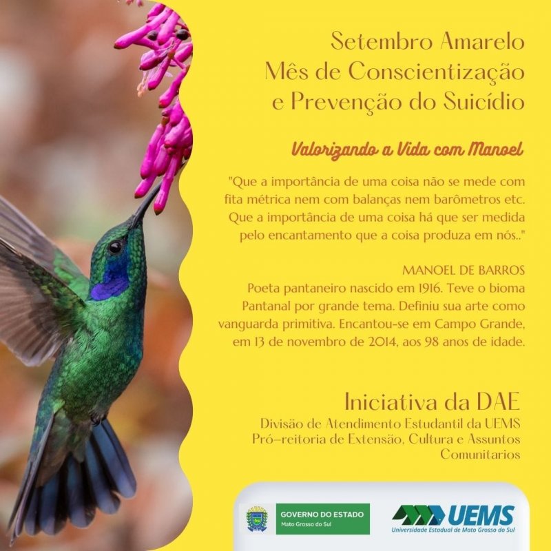 A DAE escolheu trabalhar o Setembro Amarelo de um modo poético, veiculando trechos de livros do escritor Manoel de Barros. A iniciativa "Valorizando a Vida com Manoel" tem movimentado as redes sociais oficiais da Universidade. O SAPS também vem desenvolvendo o compartilhamento de informações voltadas aos locais de atendimento especializados na temática do suicídio.