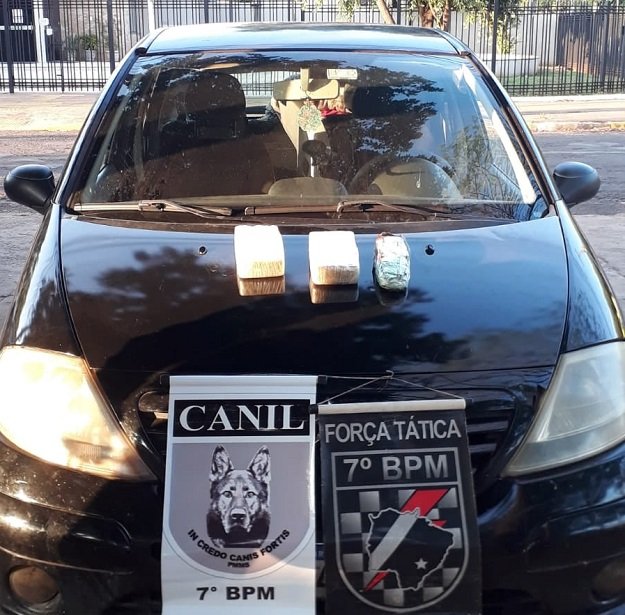 Foi solicitado apoio do Canil Setorial do 7° BPM, com os Cães Dara e Barth, onde durante a busca no referido veículo os cães fizeram a indicação nos encostos dos bancos dianteiros de 01 (um) invólucro pesando aproximadamente 473 gramas de cocaína, e de 02 (dois) tabletes de uma substância de pasta a base de cocaína pesando aproximadamente 2,112kg.