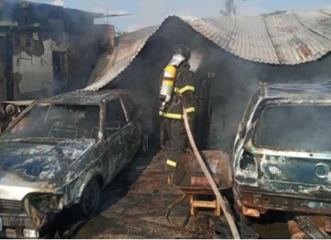 Faíscas atingem latas de thinner e 4 veículos pegam fogo em oficina mecânica