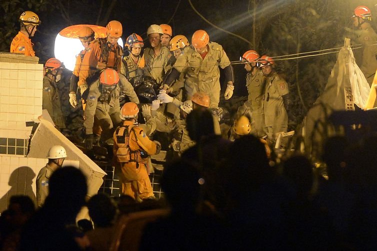 Equipes que atuam na busca e resgate de pessoas após o desabamento dos dois prédios na comunidade da Muzema. - Fernando Frazão/Agência Brasil