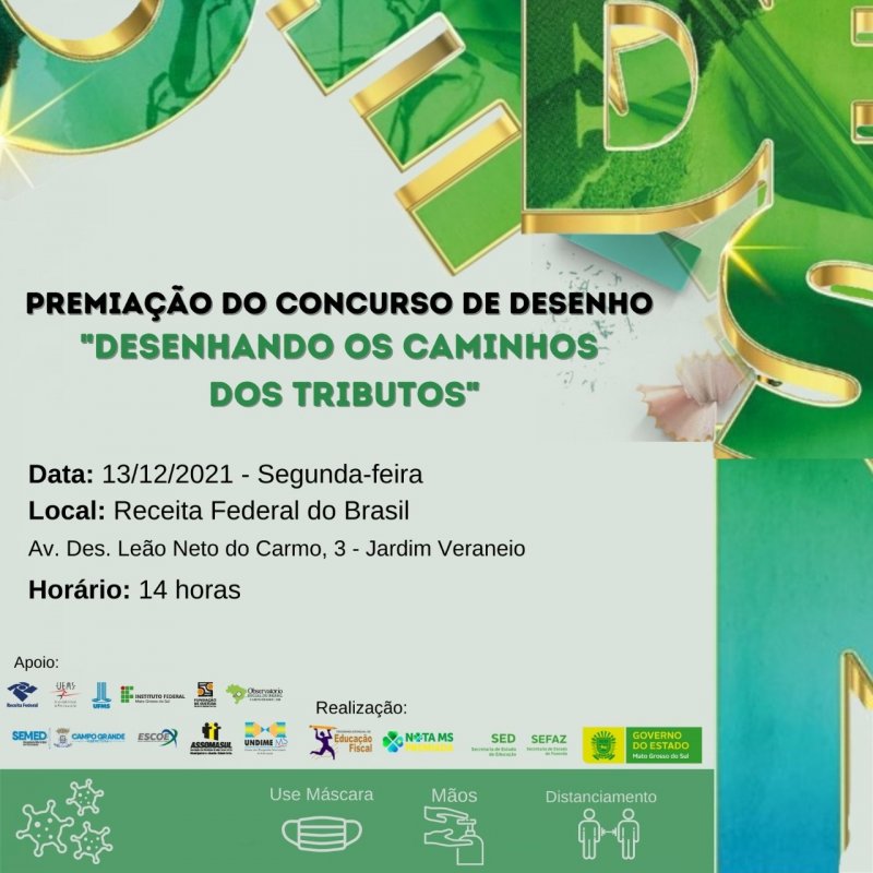 Nesta segunda-feira (13), às 14 horas, no auditório da Receita Federal do Brasil em Campo Grande, acontecerá a grande festa de premiação do concurso de desenho “Desenhando os Caminhos dos Tributos”, realização da Secretaria de Estado de Fazenda de Mato Grosso do Sul - SEFAZ/MS, por meio da Unidade de Educação Fiscal - UNDEF/MS, da Secretaria de Estado de Educação de Mato Grosso do Sul-SED/MS e demais parceiros.
