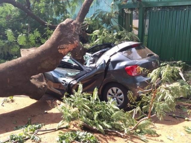 A queda de uma árvore de grande porte interditou por completo o trânsito na Rua Poá, no bairro Taquarassu, em Campo Grande, na tarde desta terça-feira (16). A Flamboyant, que estava plantada na calçada em frente a uma residência, também bloqueou o portão da casa, além de ter destruído um veículo Volkswagen Gol que estava estacionado no local.