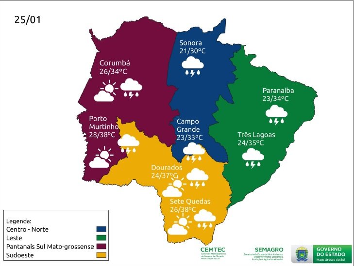 Confira no mapa as condições de tempo e temperatura estimados para esta terça-feira em Campo Grande e alguns municípios de Mato Grosso do Sul.