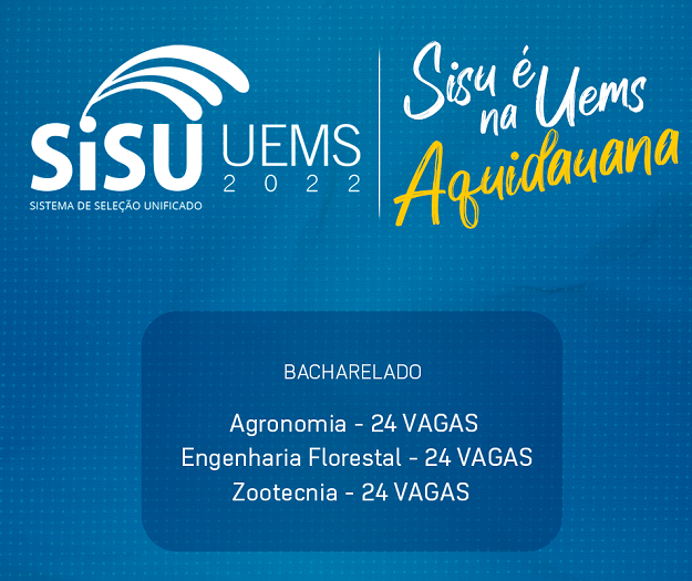 Na Unidade de Aquidauana, a Universidade Estadual de Mato Grosso do Sul (UEMS) oferta 72 vagas para os cursos de Agronomia (24 vagas), Zootecnia (24) e Engenharia Florestal (24), por meio do Sistema de Seleção Unificada (SiSU) 2022.