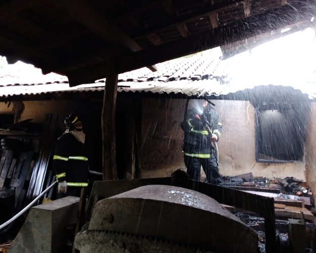 Durante o rescaldo foram utilizados aproximadamente 600 litros de água e constatado que o local servia como depósito, com restos de madeiras, forro, piso, pneus, etc.