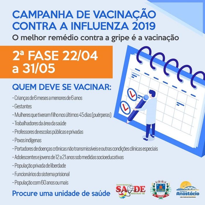 Ontem, segunda-feira, 22 de abril, foi iniciada a segunda etapa da campanha de vacinação contra a Influenza, popularmente conhecida como gripe. Todas as pessoas pertencentes aos grupos que compõem o público alvo, devem procurar suas ESFs para receberem a dose da vacina até o dia 31 de maio.
