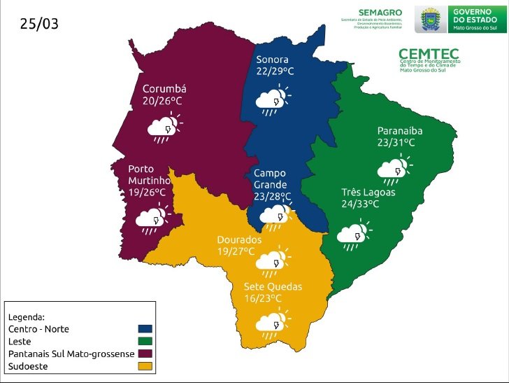As chuvas e a maior cobertura de nuvens irão provocar uma redução nas temperaturas mínimas e máximas. A tendência apontada pelo Cemtec é que ao longo do final de semana as temperaturas registrem médias entre 19/29º para a região pantaneira, 22/33ºC, 14/28ºC para a região sudoeste e na capital entre 21/28ºC.
